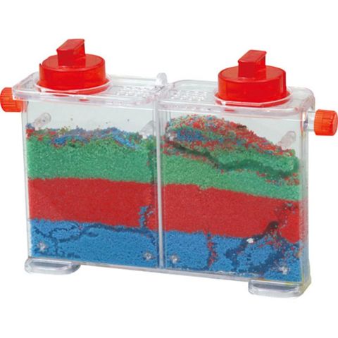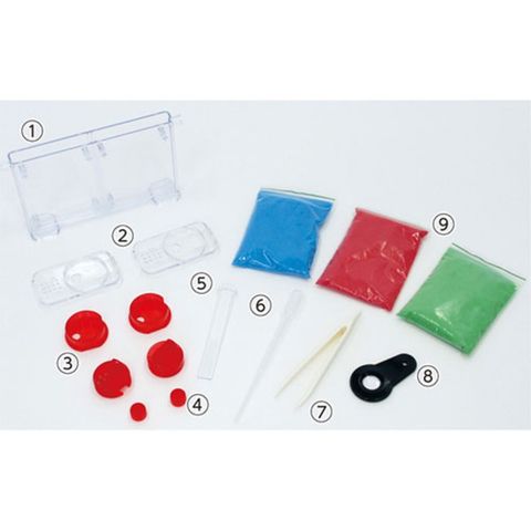 本体×1、ふた×2、仕切り板×1、アリゲッター上下×各2、接続部ふた×2、飼育砂(青赤緑)×各1、ピンセット×1、スポイト×1、ルーペ×1、解説書×1
