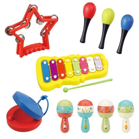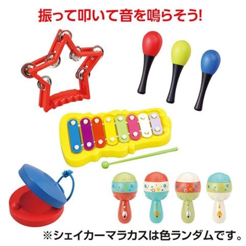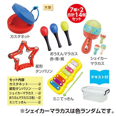 ・セット内容 : カスタネット×2、星形タンバリン 赤×2、シェイカーマラカス×2、おうえんマラカス 赤×2、おうえんマラカス 青×2、おうえんマラカス 黄×2、ミニてっきん×2、プラケース×1