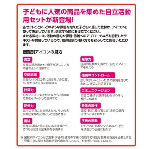 付属のテキストには活動の目的やアプローチ方法が詳しく記載されているので、指導が初めての方でも安心して取り組めます。
