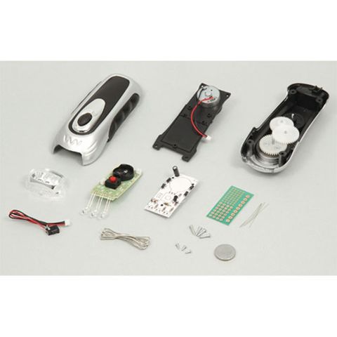 セット内容:本体(ギア取付済)×1、カバー×1、LEDカバー×1、基板×1、電子パーツ×1、はんだ×1、取付ネジ×1、外部出力コード×1、リチウムイオン蓄電池×1、はんだ付け練習用基板×1、はんだ付け練習用リード線×1