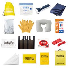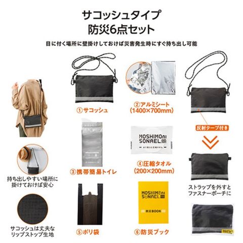 セット内容 : サコッシュ・アルミシート(1400×700mm)・携帯簡易トイレ・ポリ袋×1・圧縮タオル(200×200mm)・防災ブック