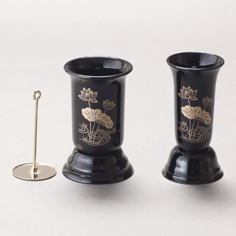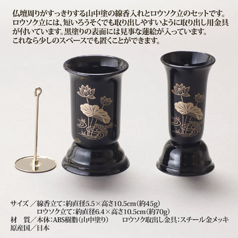 仏壇周りがすっきりする山中塗の線香入れとロウソク立のセットです。ロウソク立には、短いろうそくでも取り出しやすいように取り出し用金具が付いています。黒塗りの表面には見事な蓮絵が入っています。これなら少しのスペースでも置くことができます。