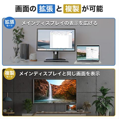 サブディスプレイを追加して画面の表示領域を広げる拡張モードと、メインディスプレイと同じ画面を表示する複製モードに対応しています。