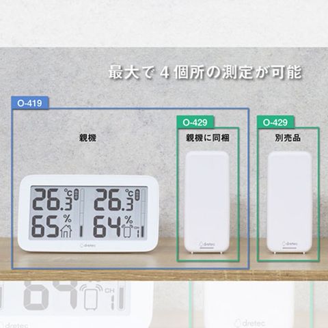 ・湿度を測定してモニタリング・ 別売の子機を2台増設した場合、最大4か所の温湿度をモニタリングできる