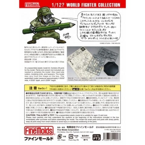 | FT3 1/12? 大日本帝国陸軍歩兵・大清水一等兵 プラモデル 漫画家・鳥山明氏のデザインと監修による兵士たちです。コミカルにディフォルメされたフィギュアをプラスチックモデル組み立てキットで立体化。銃や装備品は出来る限り1/12スケールで正確に再現し、かつ実物資料や写真等による考証をしています。貴重な鳥山氏描きおろし作品による装備品の解説書も付いています。台座付。 ※各写真は試作品を組み立て、塗装したものです。 製品とは異なる場合があります。ご了承ください。 ※別途プラモデル専用の接着剤・塗料が必要です |