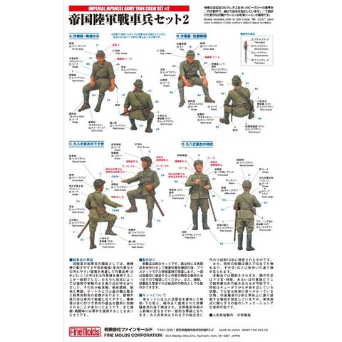 | FM23 1/35 陸軍 帝国陸軍戦車兵セット2 ■帝国陸軍戦車兵セット2 キットの内容は昭和十三年に改正された九八式軍衣の将校と下士官各1体と、作業服着用で談笑している兵2体の計4体入りです。塗装では再現が難しい階級章デカールも付属。日本軍戦車などと組み合わせてご使用ください。 |