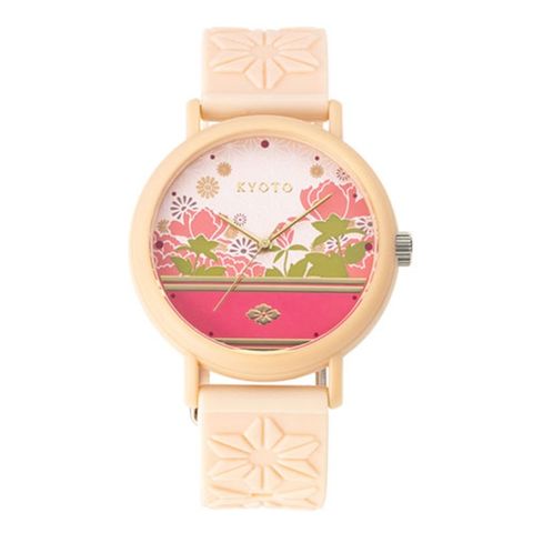 アンティーク着物に描かれた日本の伝統的な花々の紋様と、艶やかな和装の要である”帯”をデザインとして文字盤へ落とし込んだ"KYOTO-KIMONOシリーズ"。