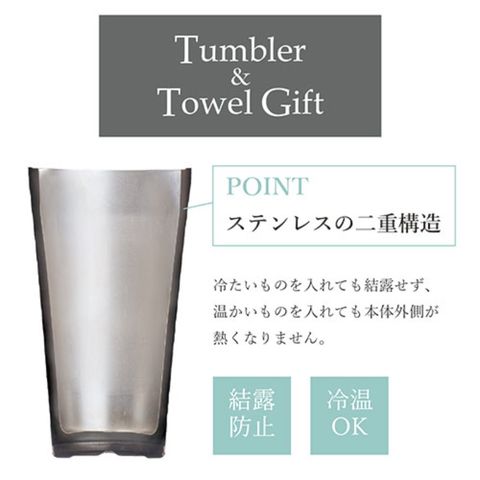 内容物 : タンブラー(φ80×145mm)・容量420ml×1、フェイスタオル(28×75cm)×1、マイクロファイバークロス(25×25cm)×2