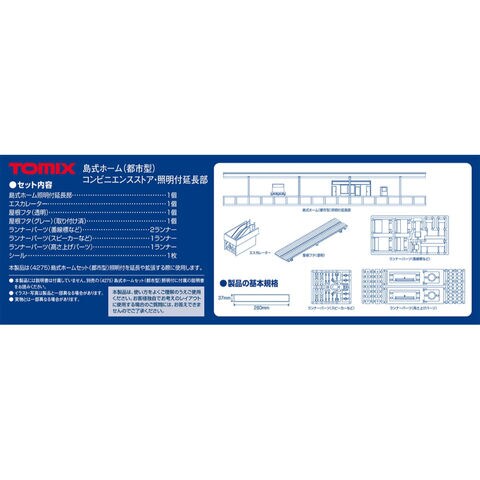| 4277 島式ホーム(都市型)コンビニエンスストア・照明付延長部 Nゲージ 駅・ホーム 近年都市部で見ることができる島式ホームを照明付きで再現する「島式ホームセット(都市型)照明付」を延長するための製品です。 ●近年見ることができるかさ上げされたプラットホームを再現 ●ホーム、駅名標、看板などの照明を標準装備 ●屋根、ベンチ、コンビニエンスストアは取付済 ●駅名標・看板などのシール付属 ●ホーム同士は付属のジョイントで連結 ●ホーム上面には点字ブロックを印刷済 ●ホームかさ上げによる 4033 橋上駅舎(近代型)、 4040 ニュー橋上駅舎に対応したかさ上げパーツ付属 ●本製品と、 4275 島式ホームセット(都市型)照明付、 4276 島式ホーム(都市型)照明付延長部、 4278 島式ホーム(都市型)売店・照明付延長部を組み合わせることでホームを長くすることができる |