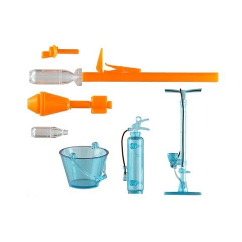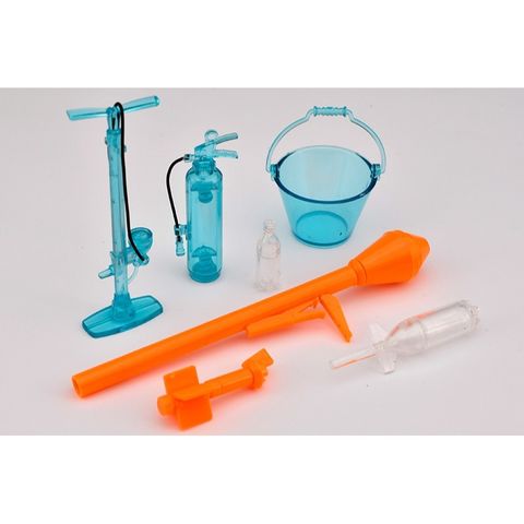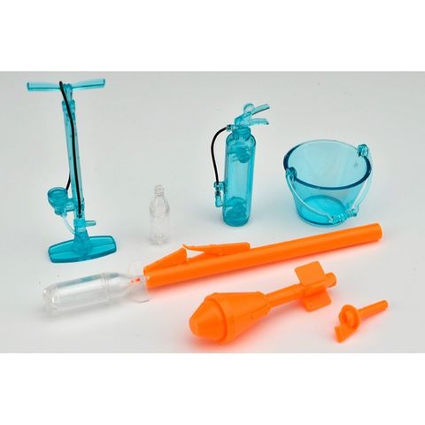 | LA091 リトルアーモリー ペットボトルロケットA クリアライトブルーとクリア、オレンジの3色による成型。 ロケット部はペットボトルとリアル弾頭の3種が選択可能。 さらに、発射用の水と圧縮空気を扱う為のバケツ&エアポンプを情景小物として用意。 消火器型水鉄砲もオマケで付けました。 ホースに見立てたワイヤーも付属します。 |