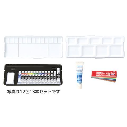 セット内容:●137×353×37mm(収納時)、●14色11mlチューブ 各1本+ホワイト20mlチューブ1本、●混色カード アクリルガッシュ用120色、パレット2枚、ミニタオル、パレットクリーナー11ml付