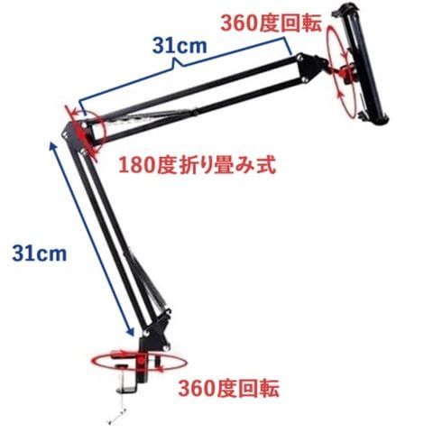 可動するアームは上下に約180度の範囲で高度、角度を自由自在に調整できます。