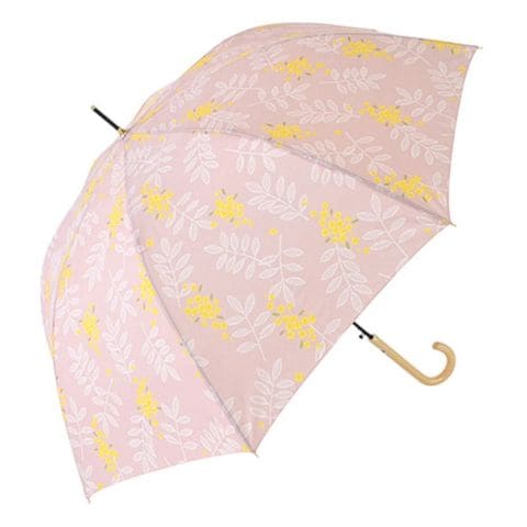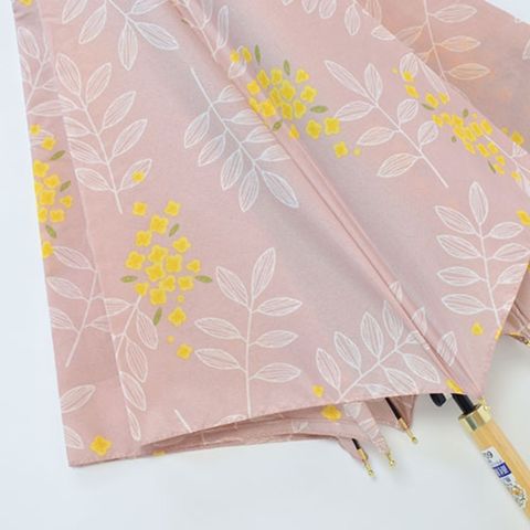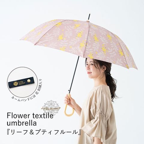 葉っぱと零れ落ちる小花の総柄プリントの、上品なかわいさの雨傘です。