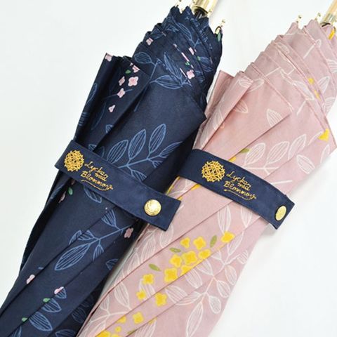 傘を留めるネームバンドにはシリーズ共通の金糸の花モチーフ刺繍&花モチーフのホックボタン付き。