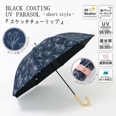 生地裏面に黒のポリウレタンコーティング加工を施しており、遮光&紫外線遮蔽率&遮熱効果に優れた(※)機能性パラソル。