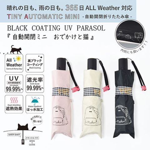 三国 MKN 遮光&遮熱 黒コーティング傘ALL Weather対応 50cm自動開閉ミニ おでかけと猫 オフホワイト S3517601 【同梱不可】[▲][AS]