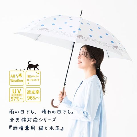 定番水玉プリント×ごろんといろんな格好で寝ている猫ちゃん達が裾にプリントされている、人気の猫柄雨晴兼用傘です。
