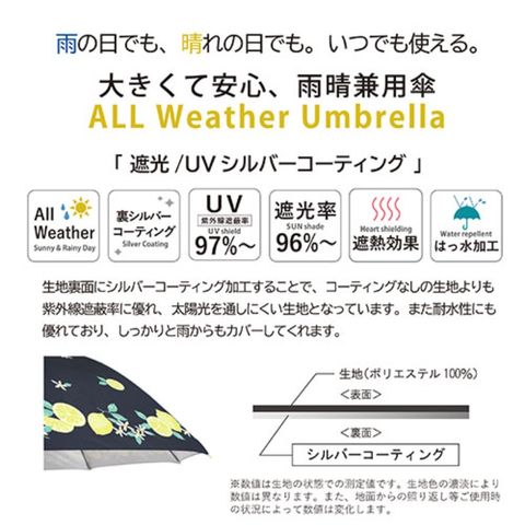 紫外線遮蔽率/遮光率に優れる(※)裏シルバーコーティング生地を使用した、全天候対応の折りたたみ傘。