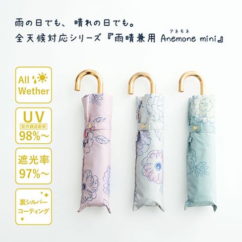 紫外線遮蔽率/遮光率に優れる(※)裏シルバーコーティング生地を使用した、全天候対応の折りたたみ傘。
