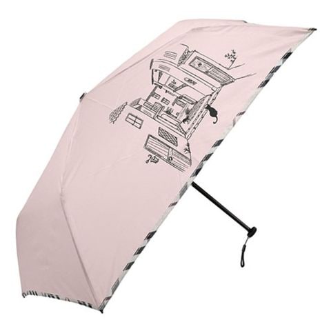 先染めチェック生地を裾にパイピング加工して、正面1駒に街をのんびりお散歩する猫をプリントした、シンプルかわいいトラッドテイストの軽量コンパクトミニ傘。