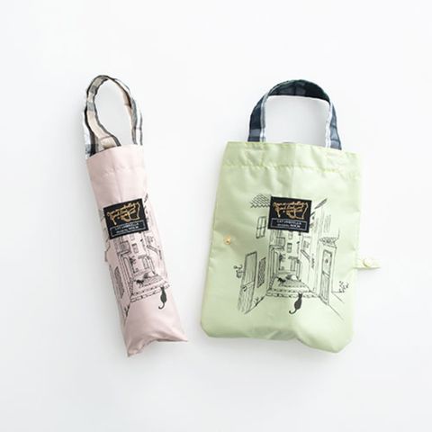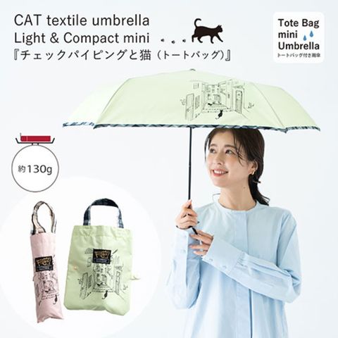 先染めチェック生地を裾にパイピング加工して、正面1駒に街をのんびりお散歩する猫をプリントした、シンプルかわいいトラッドテイストの軽量コンパクトミニ傘。