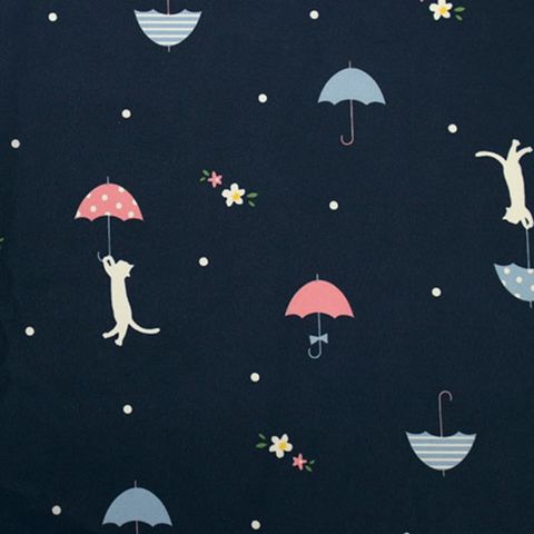 傘に傘の総柄プリントで、ところどころに傘につかまった猫ちゃんがふわりと浮いている、ユニーク&かわいいプリントの折りたたみ雨傘です。