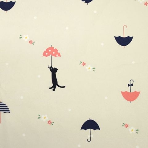 傘に傘の総柄プリントで、ところどころに傘につかまった猫ちゃんがふわりと浮いている、ユニーク&かわいいプリントの折りたたみ雨傘です。
