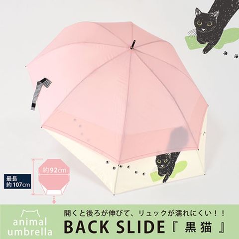 傘をさす時に後ろの内側が二重になっている部分がスライドして伸びる形状の雨傘で、後ろが長くなるので背負っているリュックも濡れにくいバックスライド傘です。