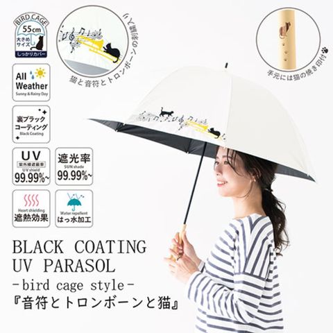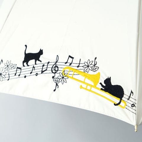 三国 MKN 遮光&遮熱 黒コーティング傘 55cm手開き 音符とトロンボーンと猫 オフホワイト S1519101 【同梱不可】[▲][AS]