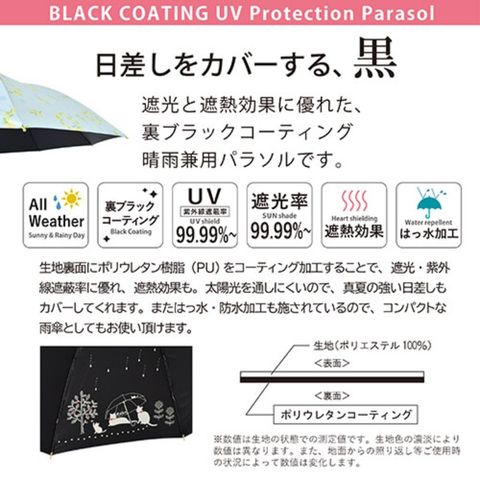 生地裏面に黒のポリウレタンコーティング加工を施しており、遮光&紫外線遮蔽率&遮熱効果に優れた(※)機能性パラソル。