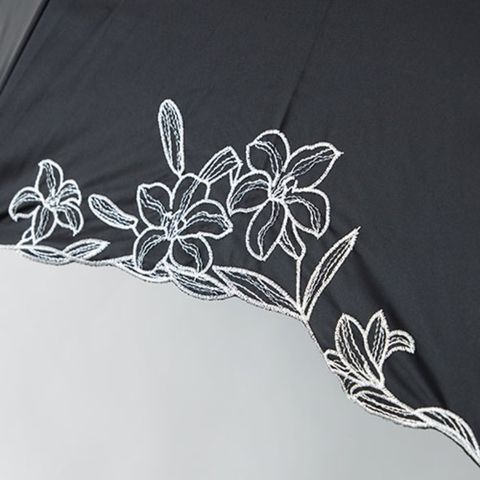 正面1駒にユリの花をキラキラの銀糸を組み合わせてスカラ刺繍した、華やかながらも上品で落ち着いたデザインの黒コーティング晴雨兼用折りたたみ傘です。