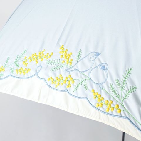 人気の「ミモザ」と「文鳥」モチーフの組み合わせが最強な、春らしい刺繍の黒コーティング晴雨兼用折りたたみ傘です。
