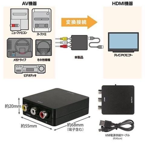 AV端子(赤白黄)をHDMI出力へ変換できます。