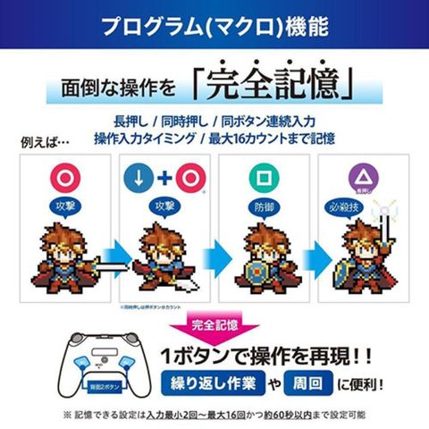 また、60秒以内に最大16ボタンまで記憶させることが可能なマクロ機能もご使用いただけ、複雑なコマンド入力などがボタン1つで発動できます。