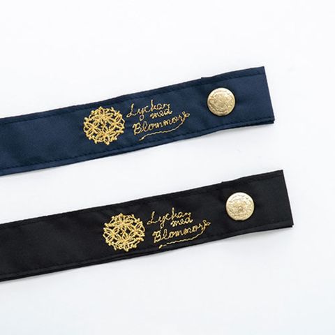 共袋のネームバンドには、シリーズ共通の金糸の花モチーフ刺繍&花モチーフのホックボタン付き。