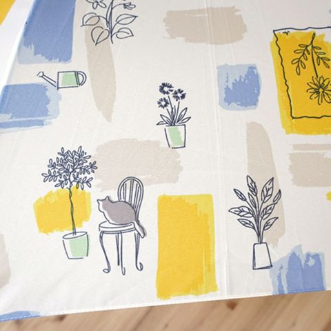 水彩風のペイントプリントに、お部屋の中でくつろぐ猫ちゃんの風景をプリントしました。
