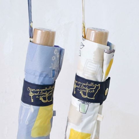 共袋のネームバンドには金糸のシリーズ共通の金糸の猫刺繍&猫のあしあとホックボタン付きになっていて、猫好きさんにおすすめの雨傘です!