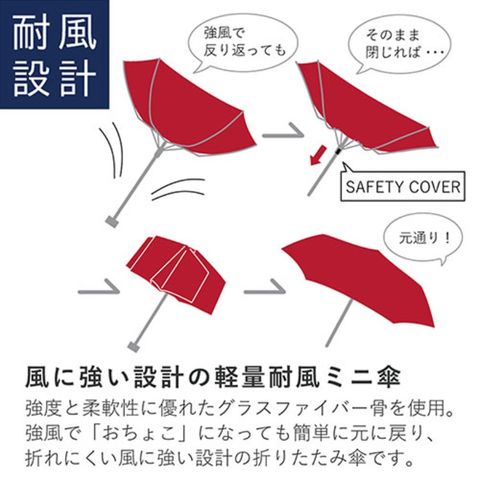強風で「おちょこ」になっても簡単に元に戻り、折れにくい風に強い設計。