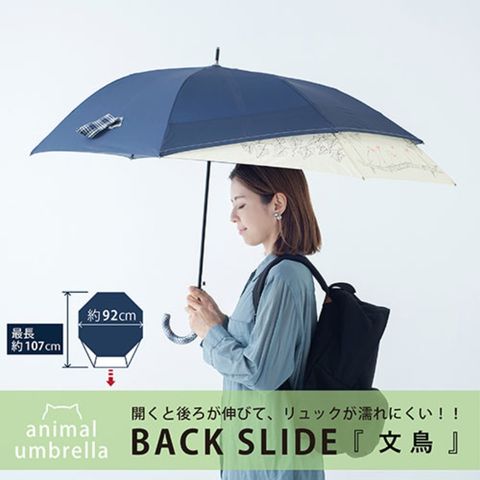 後ろが長くなるので、背負っているリュックも濡れにくいバックスライド傘です。