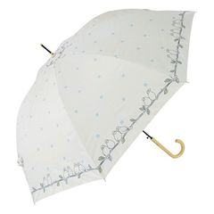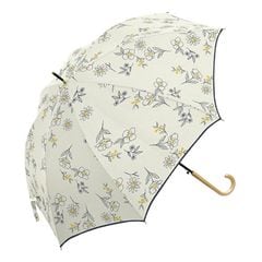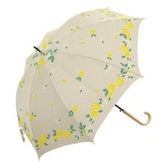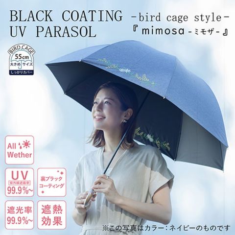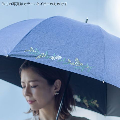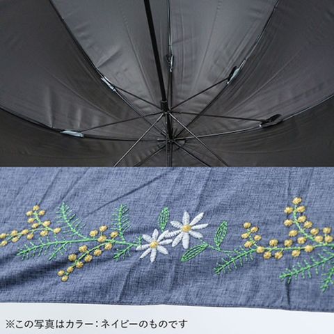 人気のミモザの花モチーフを対面2コマに刺繍した、デニム調の爽やかな生地がぴったりのナチュラルテイストの黒コーティング晴雨兼用傘です。