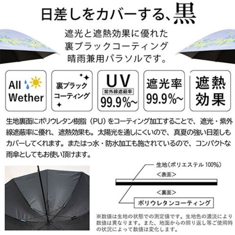 生地裏面に黒のポリウレタンコーティング加工を施しており、遮光&紫外線遮蔽率&遮熱効果に優れた機能性パラソル。
