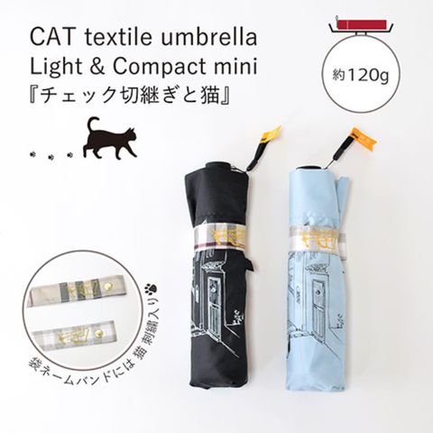 先染めチェック生地を裾に切り継ぎして、正面1駒に街をのんびりお散歩する猫をプリントした、シンプルかわいいトラッドテイストの軽量コンパクトミニ雨傘。