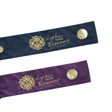 共袋のネームバンドにはシリーズ共通の金糸の花モチーフ刺繍&花モチーフのホックボタン付き。