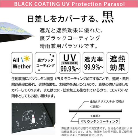 生地裏面に黒のポリウレタンコーティング加工を施しており、遮光&紫外線遮蔽率&遮熱効果に優れた(※)機能性パラソル。