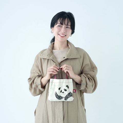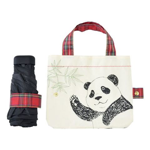 共袋は雨傘の吸水バッグ付きミニ傘とおそろいの「やあっ!」とごあいさつしているパンダさんをプリントした、きちんとたたまないでもサッと入れられるトートバッグタイプ。