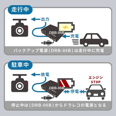 ・エンジン切ってもドラレコが録画ドライブレコーダー用バックアップ電源(停止中は(DRB-05B)からドラレコの電源となる
