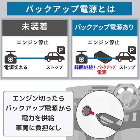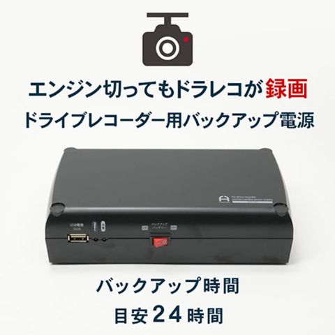 バックアップ時間の目安 : 300mA前後のドライブレコーダーで約24時間(ドライブレコーダーの動作、設定により変化します。)
