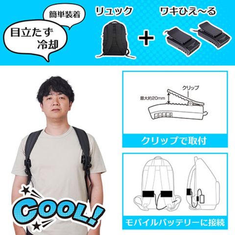 リュックに付ける冷却デバイス「ワキひえ~る」は、