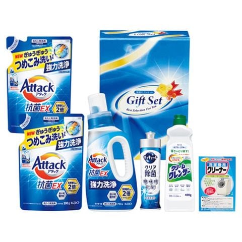 内容物 : 花王アタック抗菌EX(750g)・花王キュキュットクリア除菌(220ml)・洗濯機用クリーナーM・クリームクレンザー(400g)×各1、花王アタック抗菌EX詰め替え(590g)×2