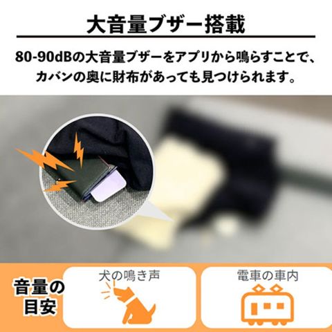 80-90dBの大音量ブザーをアプリから鳴らすことで、カバンの奥に財布があっても見つけられます。